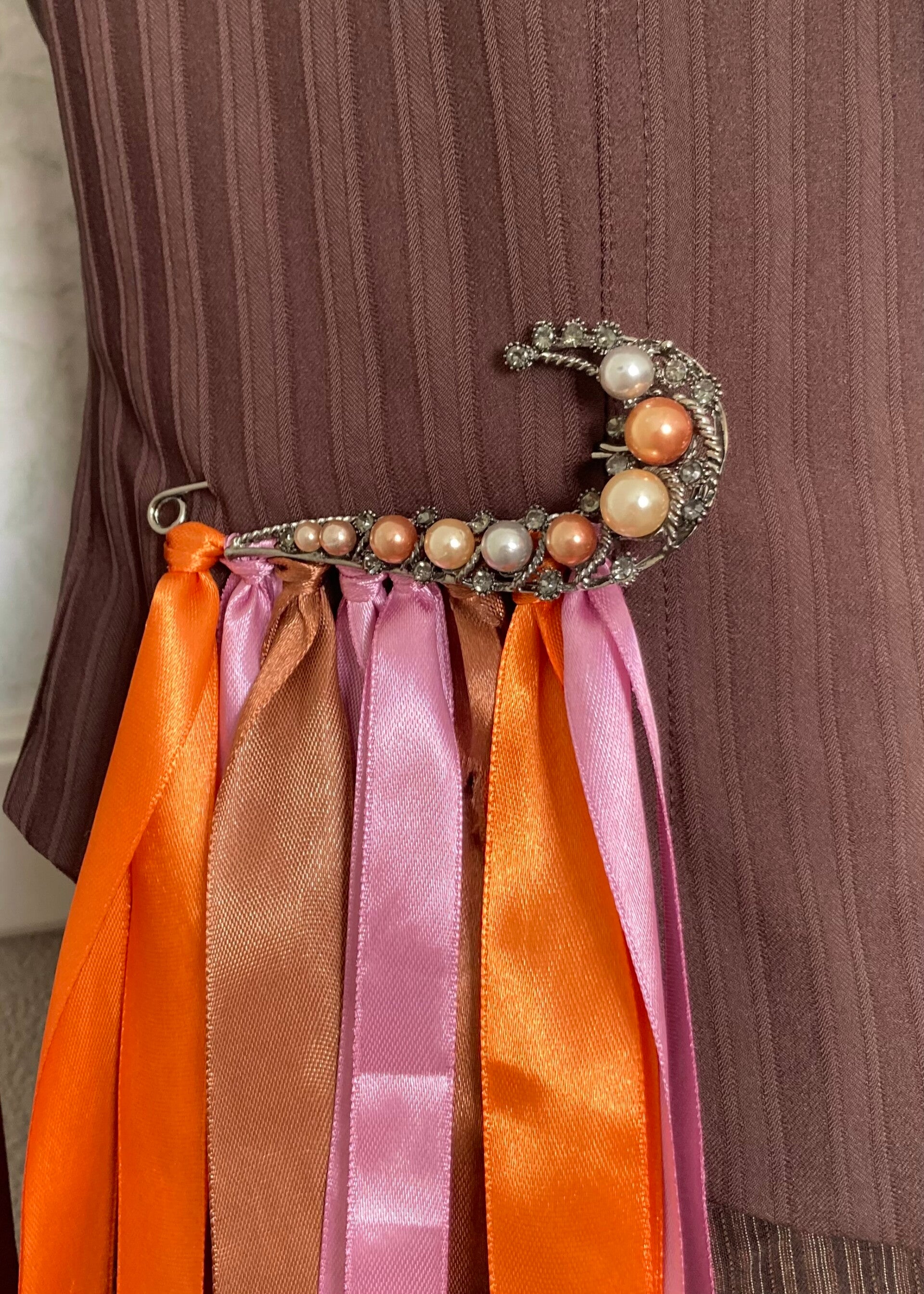 I found an amazing safety pin full of orange and purple pearls and decorations, I added some colourful ribbon to it and it became an amazing accessory. One of the most fun parts of this costume was the sash with bobbins! I found wooden bobbins at Action and two balls of multicolour yarn in pink-purple and blue-orange tones, the perfect match. I glued the yarn to the bobbins and then used a purple ribbon to tie them together in a sash. Another thrifted brooch became the top and my sash was done!