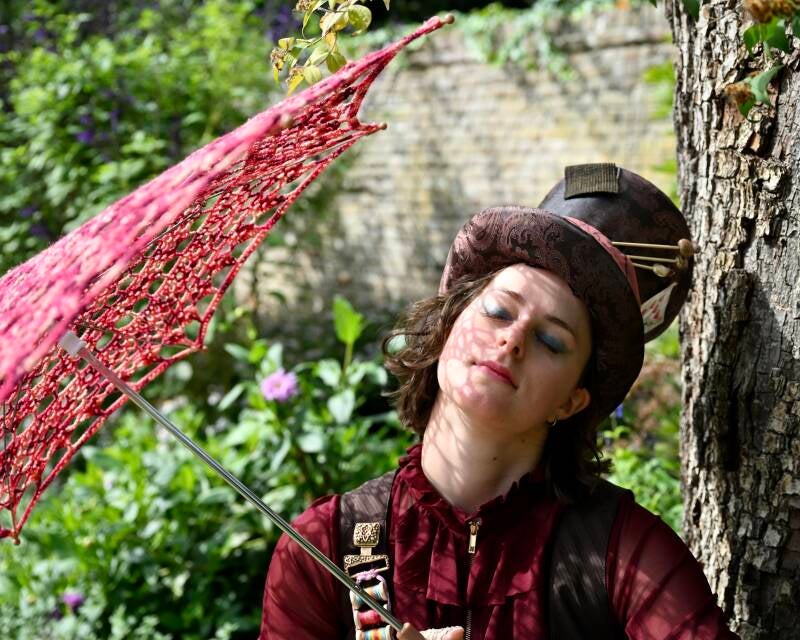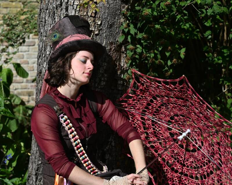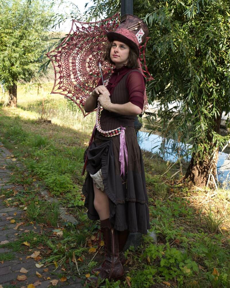 For an amazing photoshoot opportunity where rain was expected, I decided to crochet an umbrella to keep the whimsical nature of the Hatter alive while staying dry. I found a pattern online, took the same yarn as on the small bobbins and got to work. After two days of almost non-stop crocheting, I soon figured that covering the transparent umbrella that I bought for this prop would be nearly impossible (read: I got bored with the repetition of the stitches). I went to buy a children's size umbrella instead, took off the fabric and it was an almost perfect fit! I added the last two rows of my own design to make sure the umbrella wouldn't be too tight and deform and then it was done!