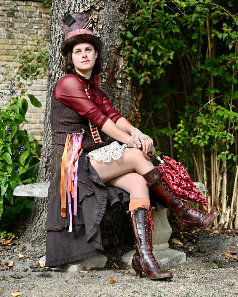 After the boots, which I had given a small makeover with some leather oil and new burgundy laces, I thrifted a small brown corset jacket which was exactly my size and fitted entirely in the style of the Mad Hatter. I took off the ugly plastic tag on the zipper and replaced it with a small metal bow, as a nod to the original Hatter's huge bow-tie.