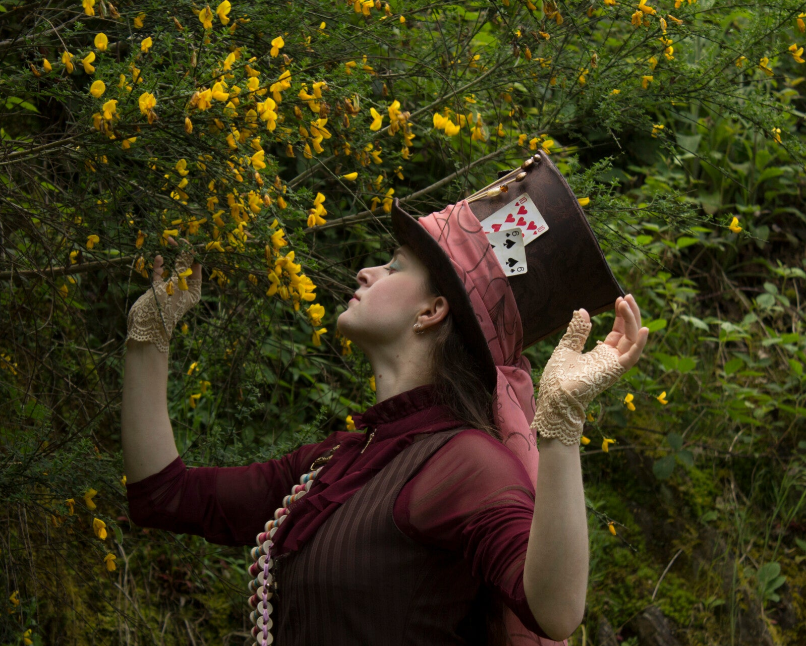 The decorations of the hat were by far the most fun part of the whole costume, since the hat is the whole character of the Mad Hatter. I found a nice scarf to tie around the base, damaged up some playing cards and dug a peacock feather out of my craft stock. A small piece of fabric from the thrift shop was another great addition. I searched for real hat pins, but encountered two problems: they were too small to be noticed well and very expensive. I made some myself with bamboo sticks and glass beads that I took from a (thrifted) necklace and voilà, hat pins!