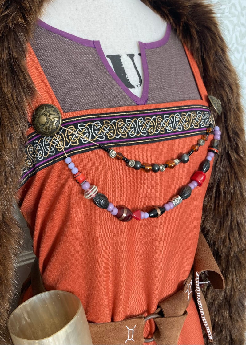 I saw the Vikings series, which were super cool, but since this event was historically accurate I wanted to make a dress that would have been worn during those times and not just a fancy leather harness. My mum and I looked up a lot of information, and found out that the dresses were made from one piece of fabric where nothing went to waste. After our trip to Norway where we saw a lot of dresses, brooches and beads in real life, we got super inspired and started right away!